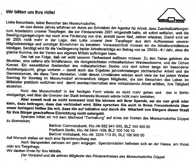 www.morgenpost.de) bzw. vor allem durch Spenden unter dem Stichwort ‚Tierhaltung‘ auf eines der Konten des Fördervereins des Museumsdorfes Düppel e.V. unterstützt werden (www.dueppel.de):Berliner Commerzbank, Kto-Nr. 682 941 000, BLZ 100 400 00