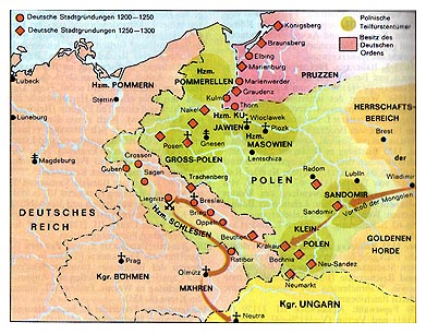- Östlich und nordöstlich der Mittel- und Ostmark (jenseits der Oder) lagen das Herzogtum Schlesien und das Königreich Polen. Letzteres wurde jedoch im 13. Jahrhundert von den einzelnen sehr einflußreichen polnischen Herzogtümern dominiert. Nordöstlich der Mark Brandenburg lag das Herzogtum Pommerellen, östlich das Herzogtum Groß-Polen. Im Jahre 1241 fielen die Mongolen (Goldene Horde) in Polen und Schlesien ein, die sich jedoch trotz ihres Sieges nach der Schlacht von Liegnitz zurückzogen. 1295 versuchte der Herzog von Großpolen, Przemysl II die Einheit durch Krönung zum polnischen König wiederherzustellen, er wurde jedoch 1296 ermordet, und 1300 bis 1305 wurde der böhmische König Wenzel II König von Polen. Der große deutsche Einfluß auf Polen im 13. Jahrhundert manifestierte sich darin, daß viele polnische Städte das Magdeburger Stadtrecht annahmen.