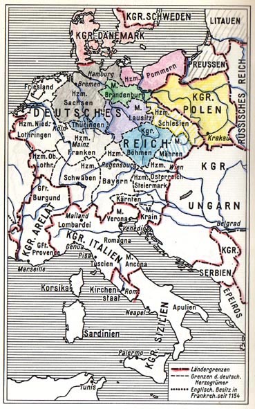 Übersichtskarte Deutsches Reich und angrenzende Herrschaftsgebiete im 13. Jahrhundert (modifiziert nach: Otto Zierer. Bilder der Jahrhunderte)